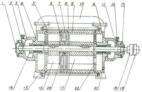 1、后軸承壓蓋 2、軸 3、軸承架 4、前后端蓋 5、短泵體 6、中間壁(B) 7、中間壁(A) 8、拉緊螺栓 9、長泵體 10、連通管 11、調(diào)整墊 12、油杯 13、前軸承壓蓋 14、填料壓蓋 15、后蓋園盤 16、短葉輪 17、長葉輪 18、泵聯(lián)軸器 19、電機聯(lián)軸器 20、軸套 21、進水孔 22、前蓋園盤